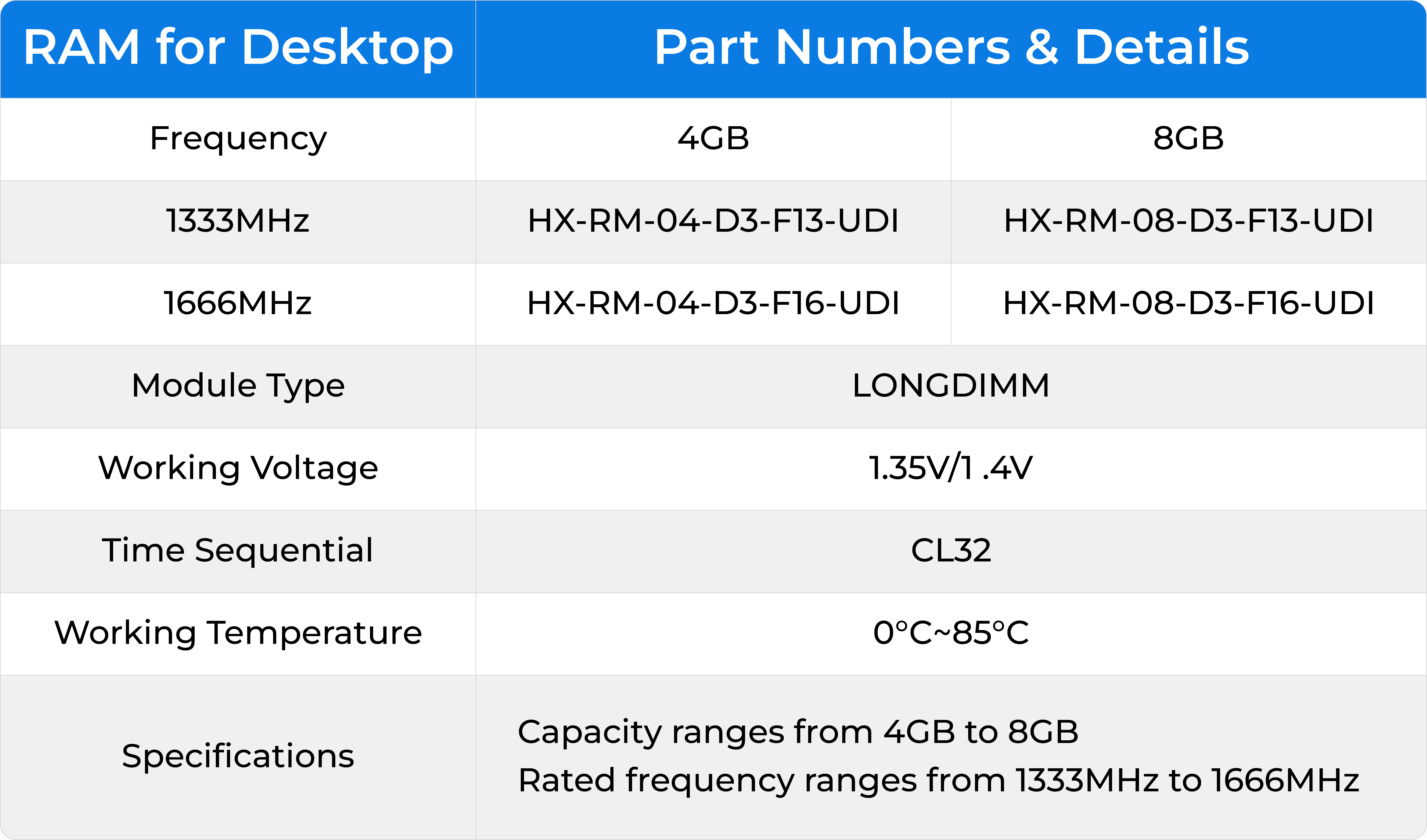 · Rated frequency ranges from 1333MHz to 1666MHz