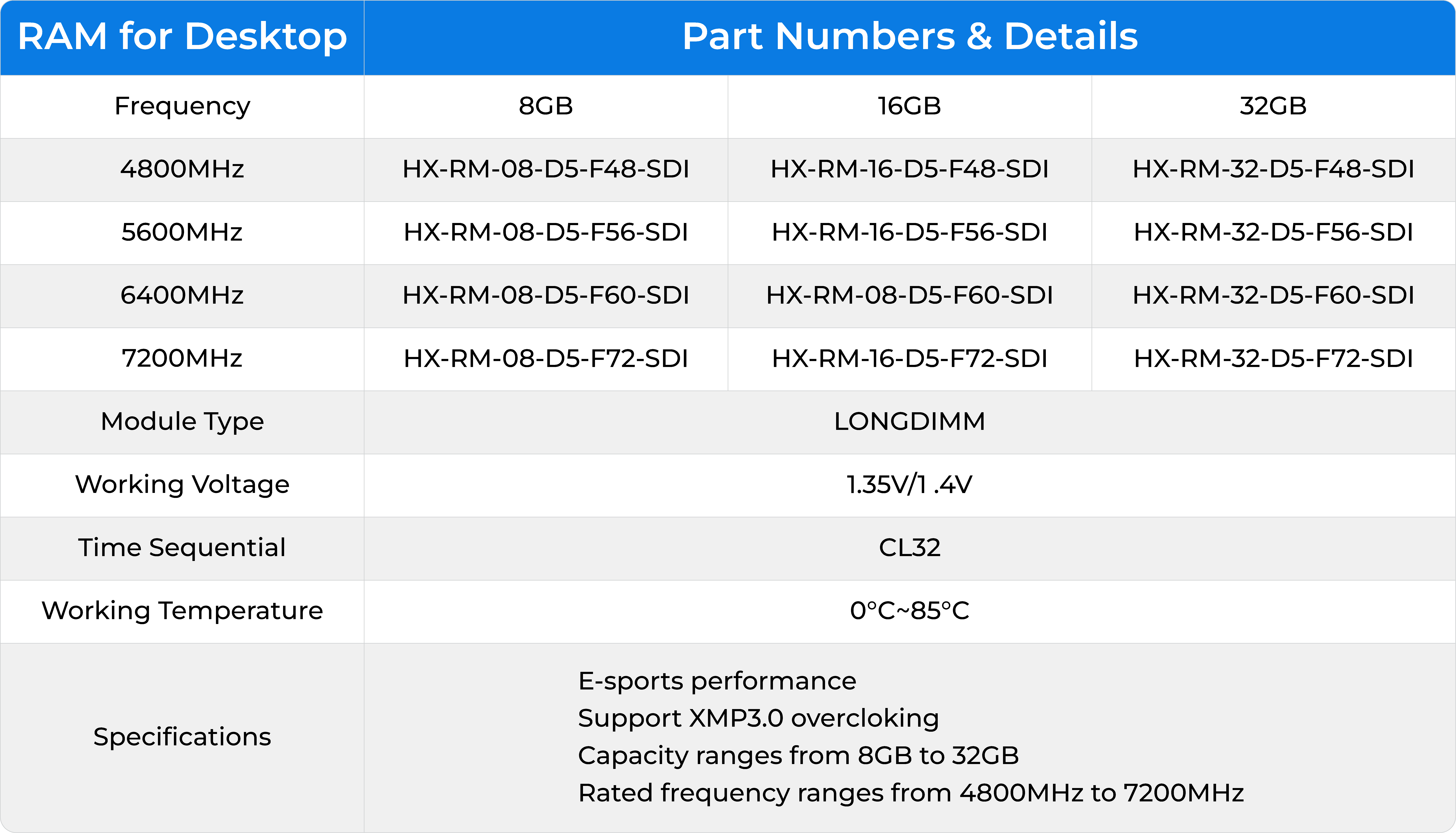 · Rated frequency ranges from 4800MHz to 7200MHz